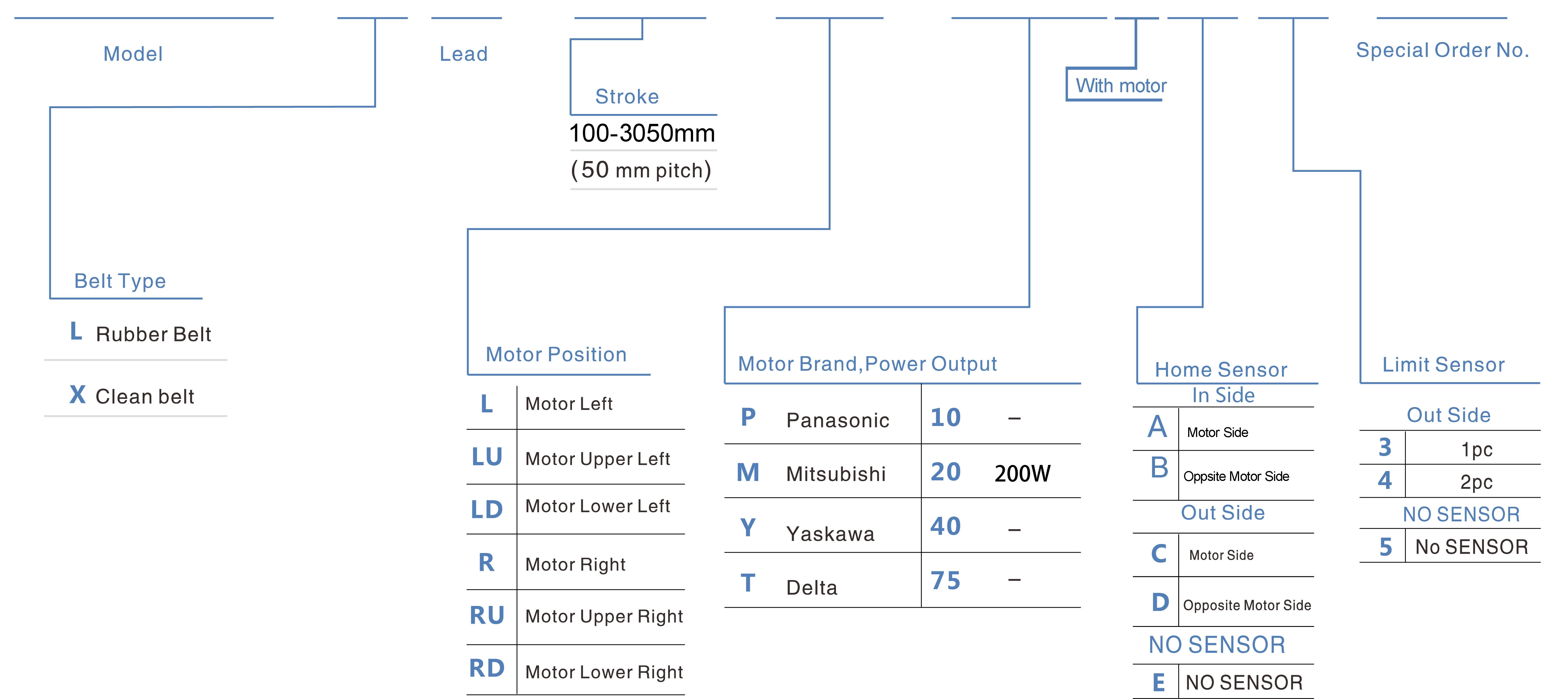 | Sử dụng ở đâu | Chế độ lái | Thông số kỹ thuật mô hình | Cơ chế giảm | Công suất động cơ (w) | Chiều rộng (mm) | Khả năng lặp lại (mm) | Thông số đai | Tải trọng tối đa (kg) | Tốc độ tối đa (mm/s) *1 | ||