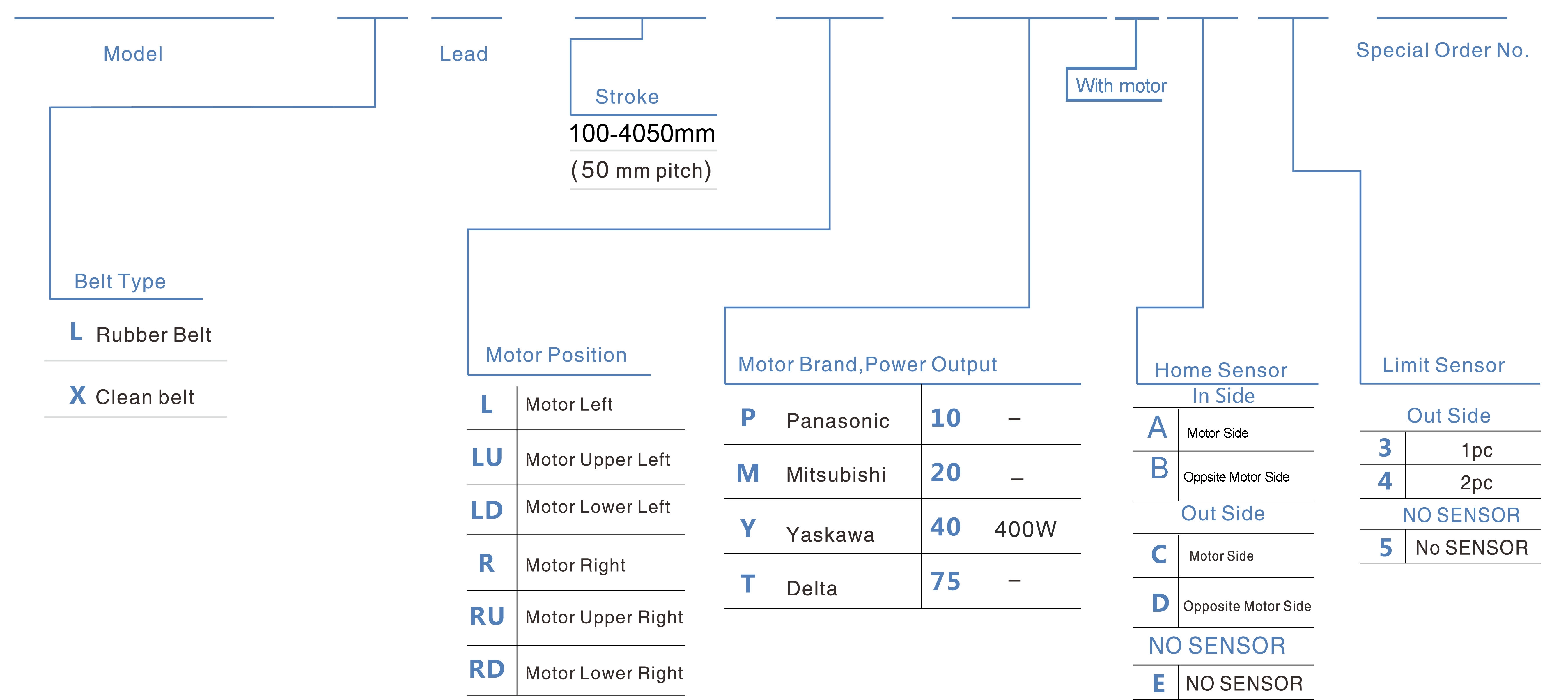 | Sử dụng ở đâu | Chế độ lái | Thông số kỹ thuật mô hình | Cơ chế giảm | Công suất động cơ (w) | Chiều rộng (mm) | Khả năng lặp lại (mm) | Thông số đai | Tải trọng tối đa (kg) | Tốc độ tối đa (mm/s) *1 | ||