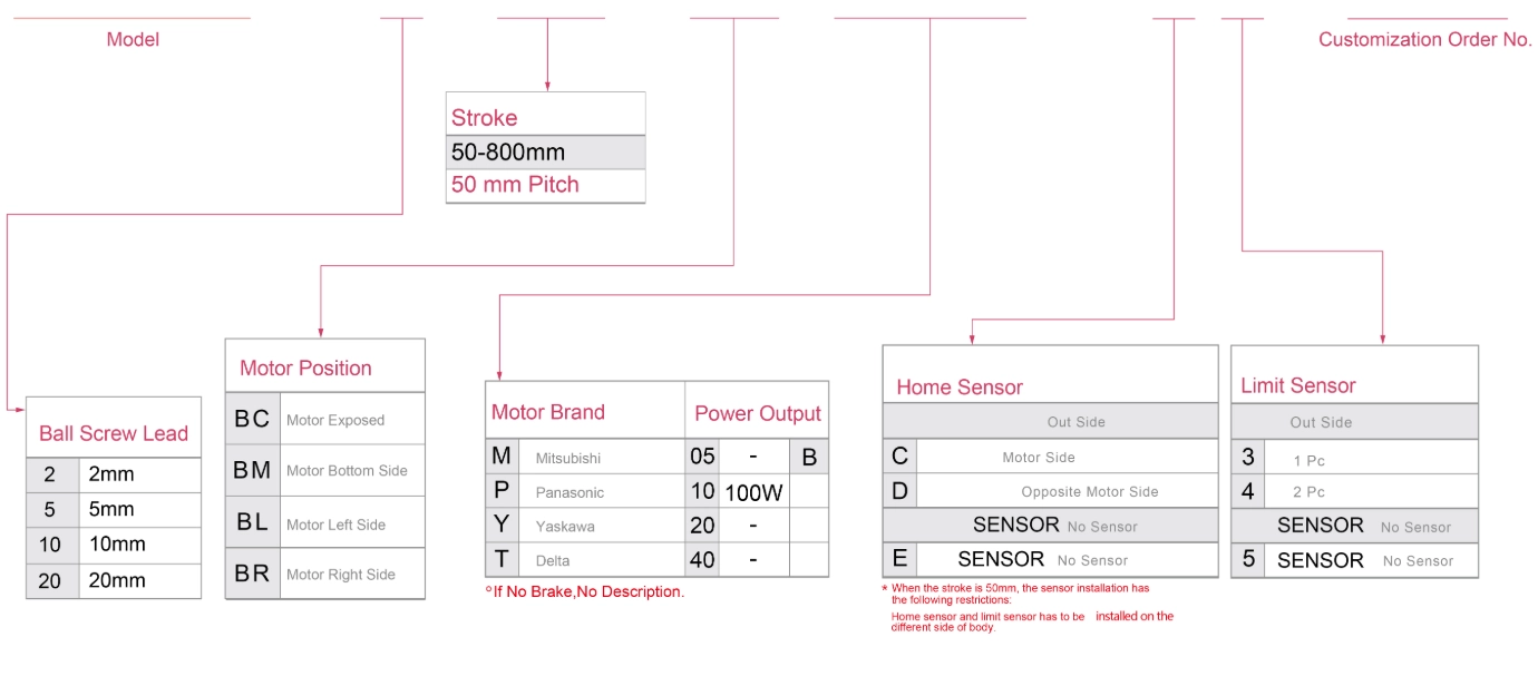 | Sử dụng ở đâu | Chế độ lái | Thông số kỹ thuật mô hình | Công suất động cơ (w) | Chiều rộng (mm) | Khả năng lặp lại (mm) | Thông số kỹ thuật vít bi | Tải trọng tối đa (kg) | Tốc độ tối đa (mm/s) *1 | ||