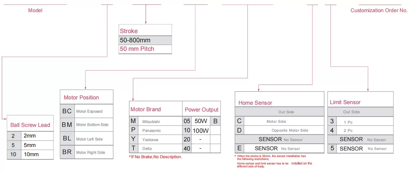 | Sử dụng ở đâu | Chế độ lái | Thông số kỹ thuật mô hình | Công suất động cơ (w) | Chiều rộng (mm) | Khả năng lặp lại (mm) | Thông số kỹ thuật vít bi | Tải trọng tối đa (kg) | Tốc độ tối đa (mm/s) *1 | ||