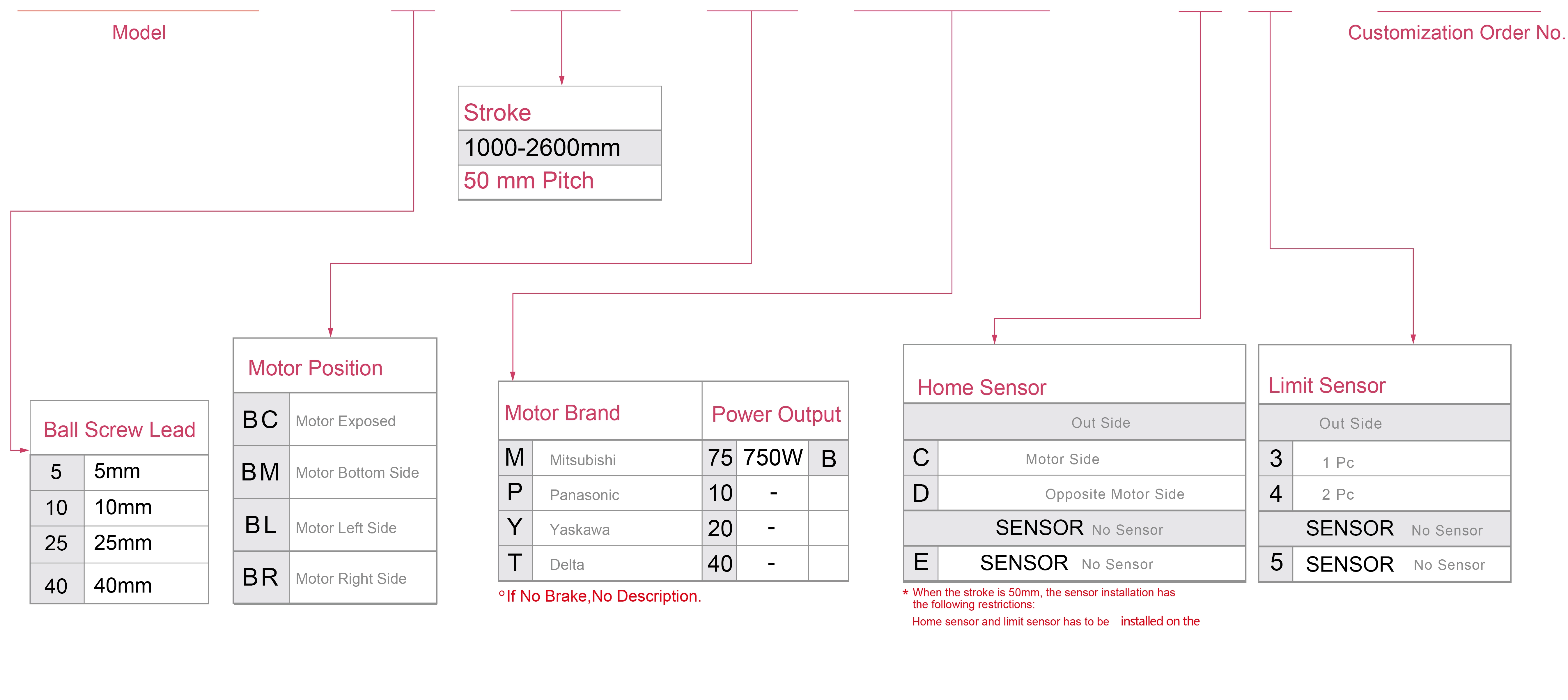 | Sử dụng ở đâu | Chế độ lái | Thông số kỹ thuật mô hình | Công suất động cơ (w) | Chiều rộng (mm) | Chiều cao của cơ thể (mm) | Khả năng lặp lại (mm) | Thông số kỹ thuật vít bi | Tải trọng tối đa (kg) | Tốc độ tối đa (mm/s) *1 | ||||||||||