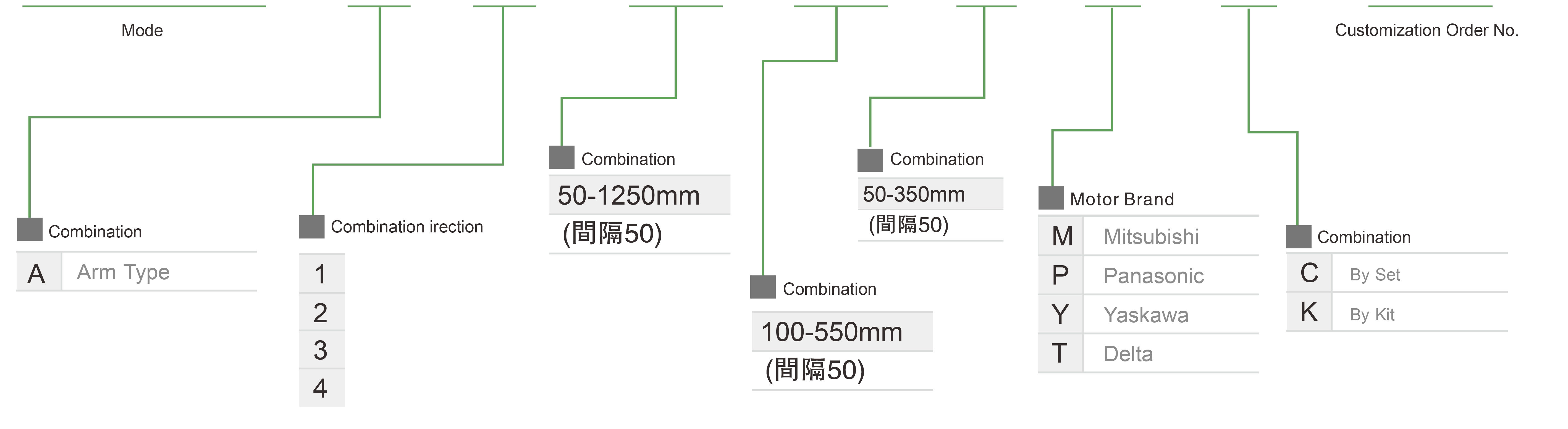 | Sử dụng ở đâu | Chế độ lái | Thông số kỹ thuật mô hình | Sự kết hợp | Số trục | Chỉ huy | Tốc độ tối đa (mm/s) | Hành trình (mm) | ||||||